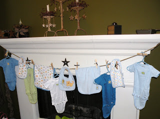 Double-duty decor! Baby clothes on a clothes line, which my son will soon be wearing.
