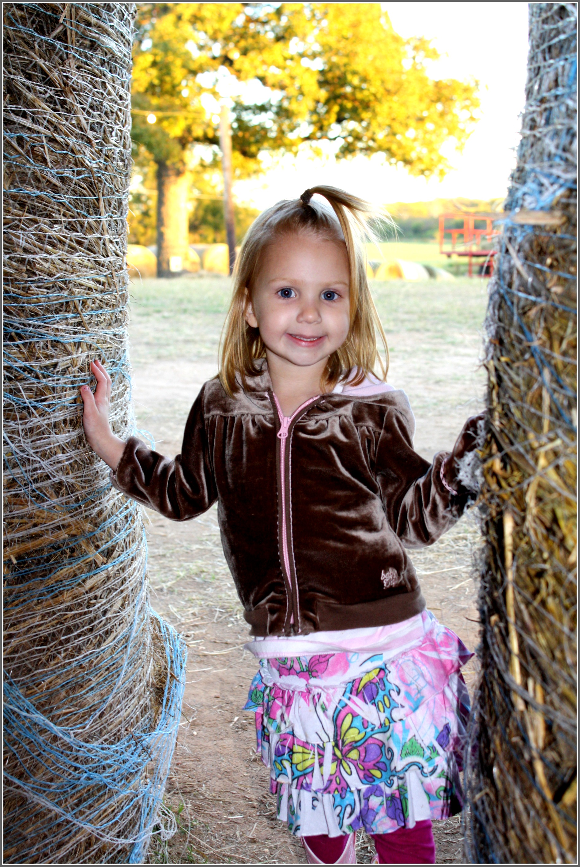 We rode “horse” swings, climbed a hay castle (well, MeMe and I sat that one out…), found our way through the hay maze, played on slides, threw (fake) chickens, roasted hot dogs, rode a cow train, and picked pumpkins.