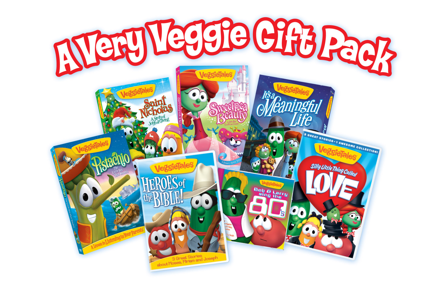 Starting with Saint Nicholas: A Story of Joyful Giving, you will find VeggieTales’ theory on giving in the lyrics of one of the show’s songs, “I can love because God loves me, I can give because God gave. Jesus’ love is why I’m smiling, why I’m giving everyday.” In addition to Saint Nicholas, the gift pack includes Sweetpea Beauty, A Silly Little Thing Called Love, It’s A Meaningful Life, Pistachio, Heroes of the Bible, and Bob and Larry Sing the 80’s CD!