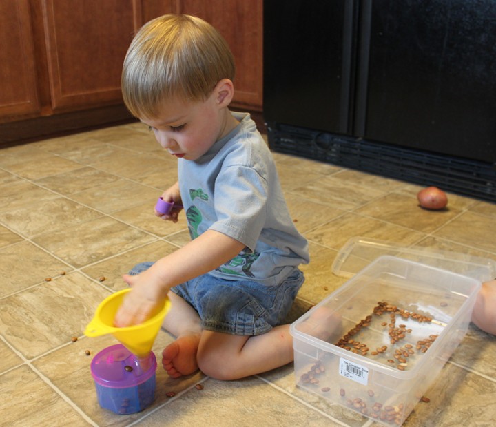 @Nina, The trick is to vary it up – the beans are fun because we only do them about once every two weeks or less. In the fall, we like to collect acorns to play with. Another fun thing is to give them a laundry basket full of socks, etc. to pick up with kitchen tongs. Or have them transfer the socks to the drawers with the tongs!