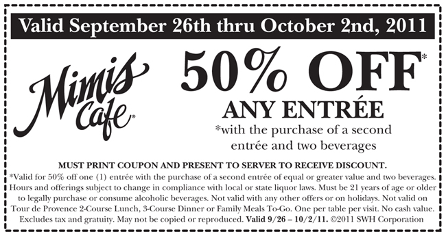 - Mimis Cafe Coupon – Buy 1 Entree Get 1 50% Off WYB 2 Drinks (exp: 10/2/2011)