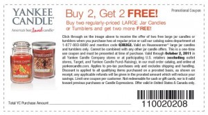 - Yankee Candle Coupon – Buy 2 Large Jar Candles or Tumblers Get 2 Free (exp: 10/2/2011)