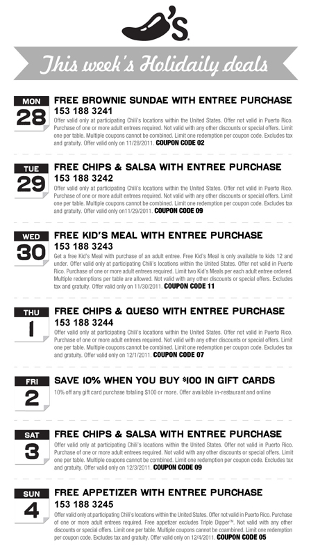 - Chilis Coupon – New Coupon Daily Through 12/4 (exp: 12/4/2011)