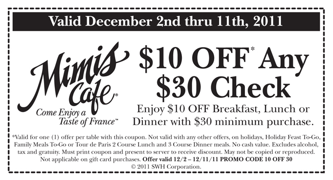 - Mimis Cafe Coupon – $10 Off $30 Purchase (exp: 12/11/2011)