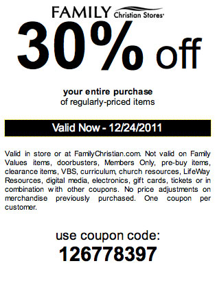 - Family Christian Coupon – 30% Off Entire Purchase of Regularly Priced Items (exp: 12/24/2011)