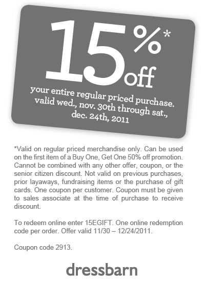 - Dress Barn Coupon – 15% Off Regulary Priced Purchase (exp: 12/24/2011)