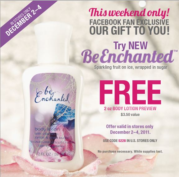 - Bath and Body Works Coupon – FREE Be Enchanted 2 oz. Body Lotion (no purchase necessary!) (exp: 12/4/2011)