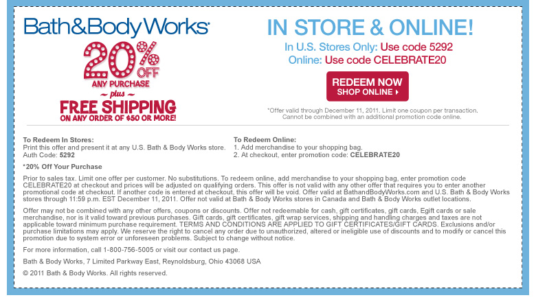 - Bath and Body Works Coupon – 20% Off Any Purchase (exp: 12/11/2011)