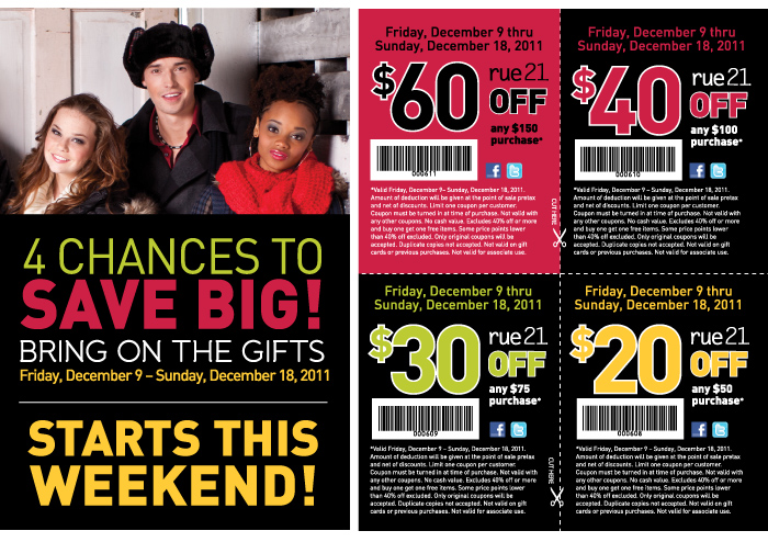 - Rue 21 Coupon – $20 Off $50 Purchase + More Coupons Starting 12/9 (exp: 12/18/2011)
