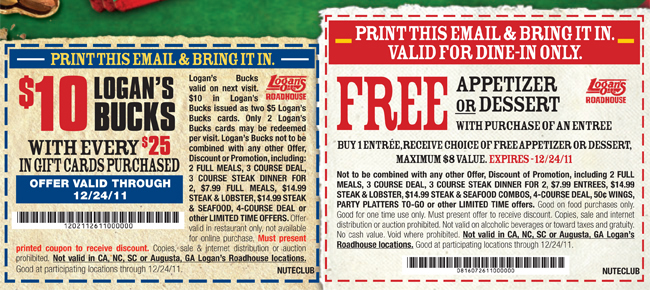 - Logans Roadhouse Coupon – Free Appetizer or Dessert WYB 1 Entree + More (exp: 12/24/2011)