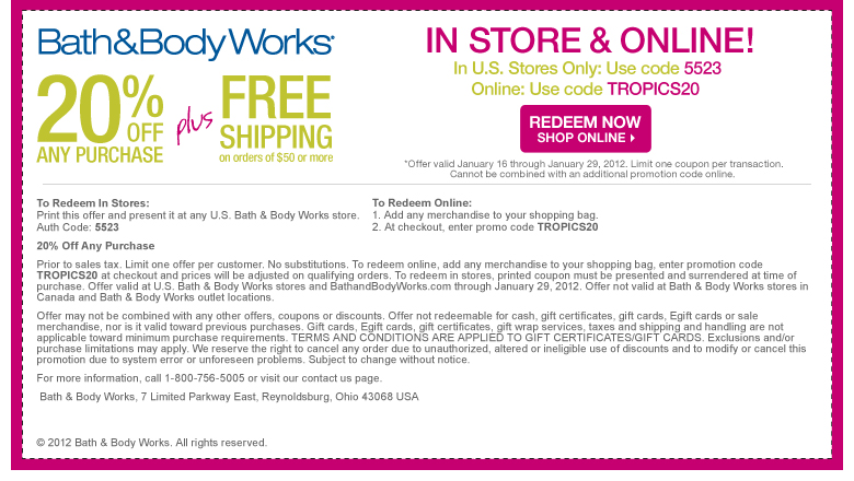 - Bath and Body Works Coupon – 20% Off Entire Purchase (exp: 1/29/2012)