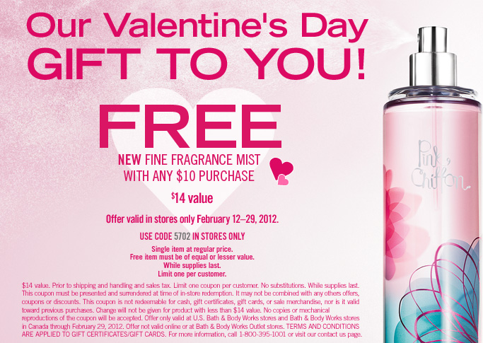 - Bath & Body Works Coupon Free Fine Fragrance Mist with $10 Purchase Starting 2/12 (exp: 2/29/2012)