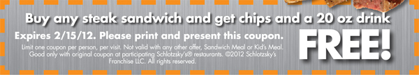 - Schlotzsky’s Coupon Free Chips & Drink WYB Any Steak Sandwich (exp: 2/15/2012)