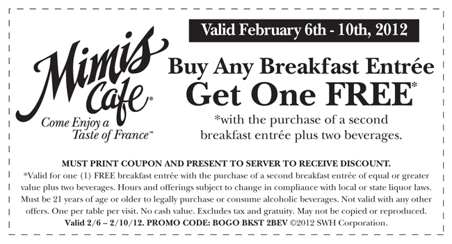 - Mimis Cafe Coupon Buy Any Breakfast Entree Get 1 Free WYB 2 Beverages (exp: 2/10/2012)
