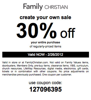 - Family Christian Coupon 30% Off Entire Regularly Priced Purchase (exp: 2/26/2012)