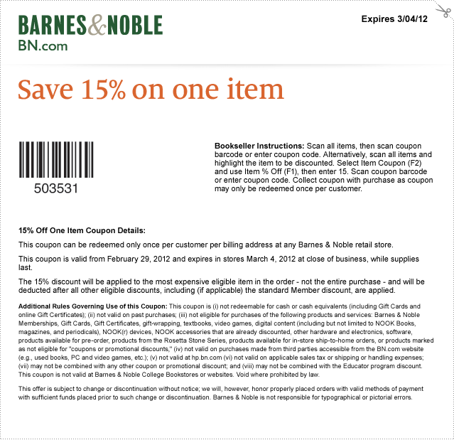 - Barnes and Noble Coupon – 15% Off 1 Item (exp: 3/4/2012)