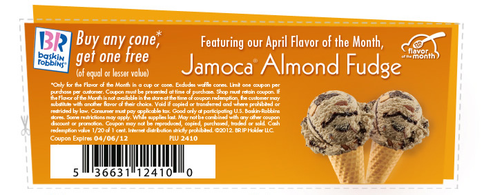 - Baskin Robbins Coupon – Buy 1 Cone Get 1 Free (exp: 3/5/2012)