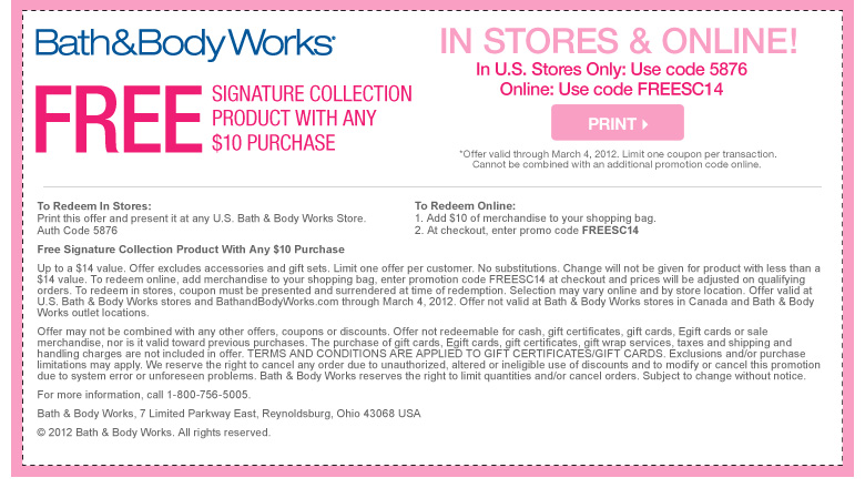 - Bath and Body Works Coupon – Free Signature Collection Product with $10 Purchase (exp: 3/4/2012)