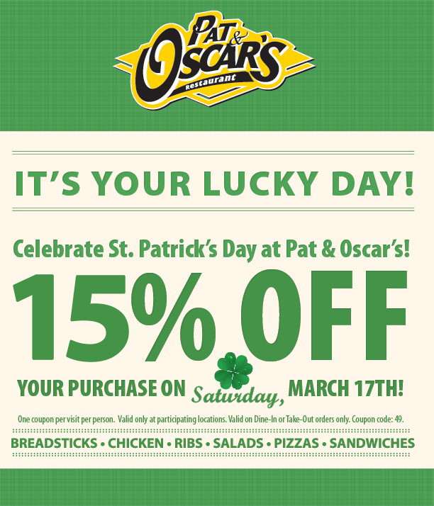 - Pat & Oscar’s Coupon 15% Off Entire Purchase on 3/17 Only
