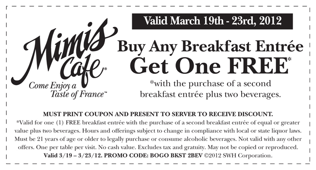 - Mimis Cafe Coupon Buy Any Breakfast Entree Get 1 Free WYB 2 Beverages (exp: 3/23/2012)