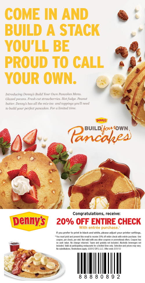 - Denny’s Coupon 20% Off Entire Check with Entree Purchase (exp: 3/31/2012)