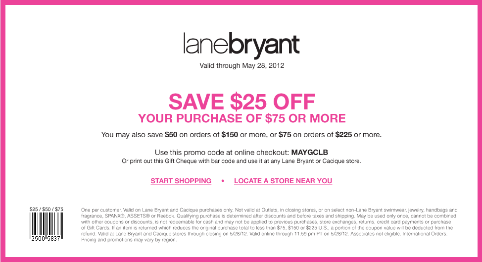 - Lane Bryant Coupon – $25 Off $75 Purchase (exp: 5/28/2012)