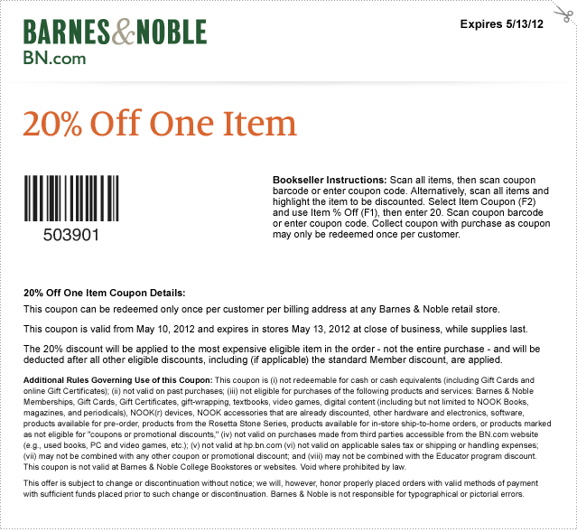 - Barnes and Noble Coupon – 20% Off 1 Single Item (exp: 5/13/2012)