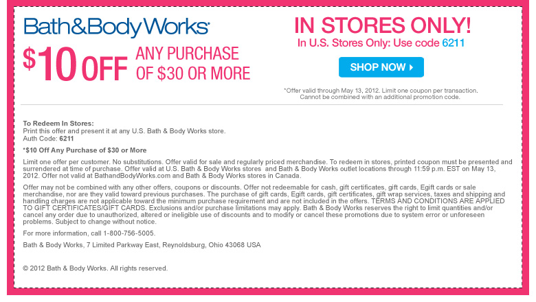 - Bath and Body Works Coupon – $10 Off $30 Purchase (exp: 5/13/2012)