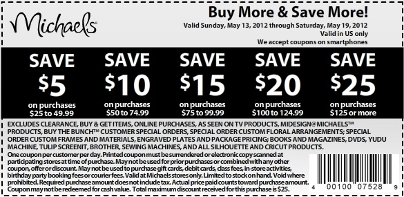 - Michaels Coupon – $5 Off Every $25 Purchase (exp: 5/19/2012)