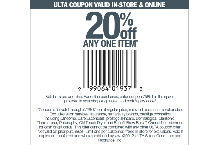 - Ulta Coupon – 20% Off 1 Item (exp: 5/26/2012)