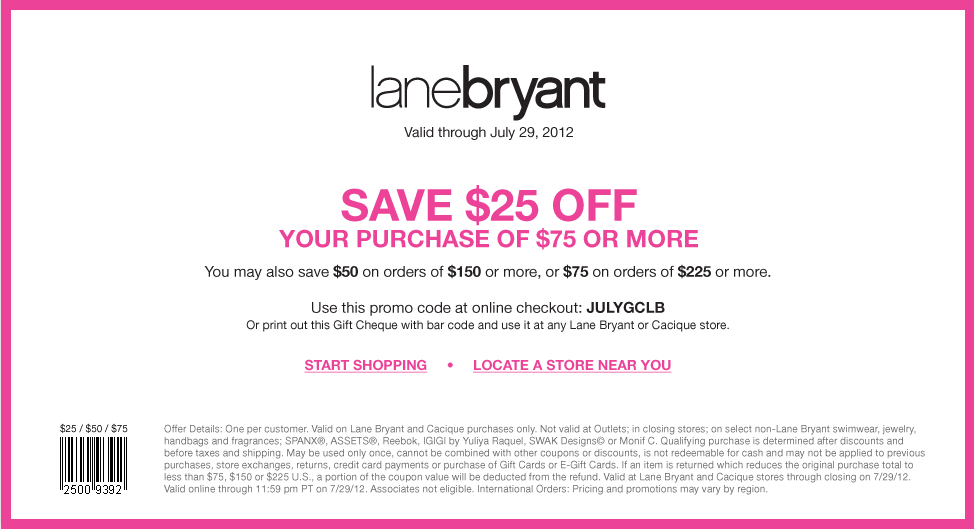 - Lane Bryant Coupon – $25 Off $75 Purchase (exp: 7/29/2012)