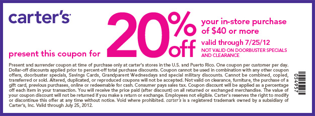 - Carters Coupon – 20% Off $40 Purchase (exp: 7/25/2012)