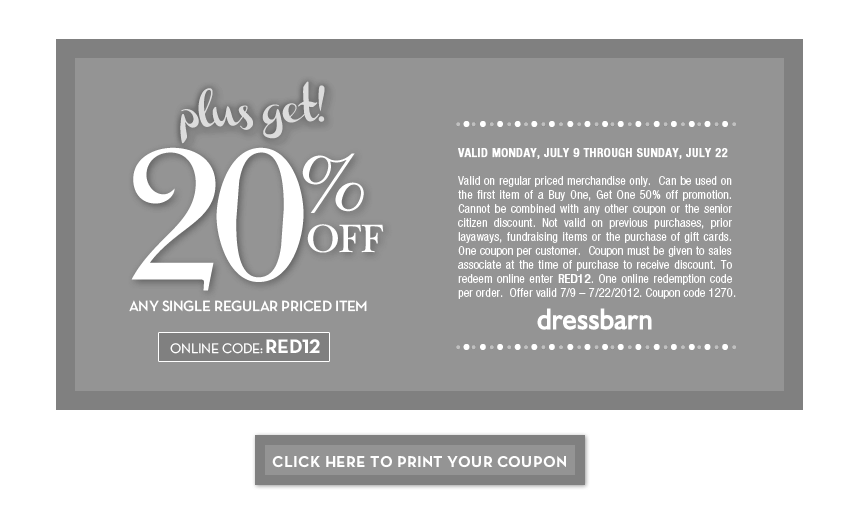 - Dress Barn Coupon – 20% Off 1 Item (exp: 7/22/2012)