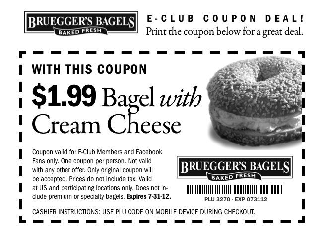 - Brueggers Coupon – $1.99 Bagel & Cream Cheese (exp: 7/31/2012)